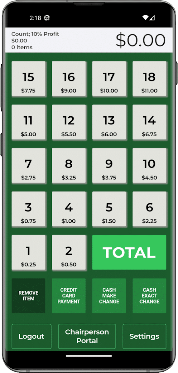 The Cash Register App allows you to simply push the button on the app that corresponds to a Price Code found on each item. The App automatically adds up each item – making check out Fast & Easy!
